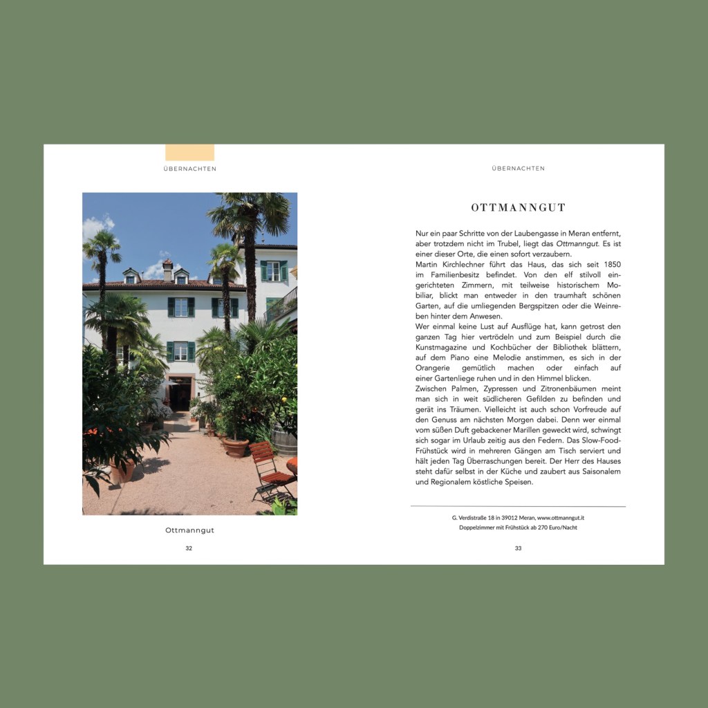 Das Meraner Land ist schon lange ein beliebtes Urlaubsziel vieler Erholungssuchender. In den letzten Jahren hat sich dort einiges Neues und Spannendes entwickelt und die Region wird auch für jüngere Reisende wieder interessanter. In HOLYDAY GUIDE – MERAN UND UMGEBUNG zeigt Autorin Christina Berlinghof genau diese wundervollen Orte und gibt Empfehlungen in den Kategorien ‚übernachten‘, ‚genießen‘ und ‚gönnen‘.